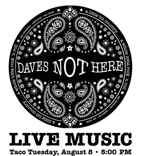 Join us for a special Taco Tuesday this week from 5-8pm as we enjoy a live performance by our member band: "Dave's Not Here". Adults: $15++ and Kids (aged 4-9yrs) only $12++ includes free outdoor play for kids (face painting, crafts, games) Buffet includes all you can eat tacos, empanadas, churros, and more!