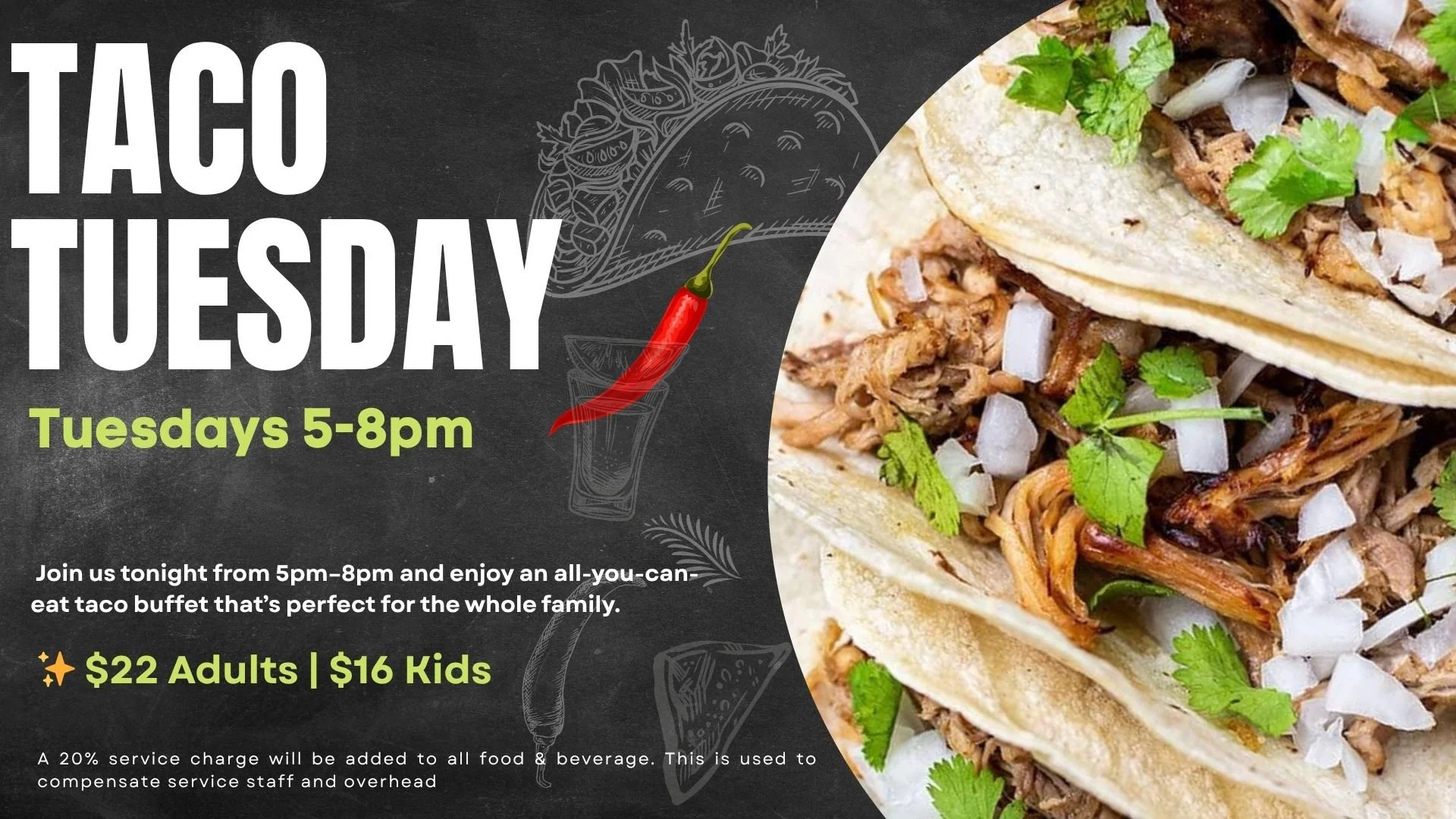 Join us on Tuesdays from 5-8pm upstairs for our Taco Tuesday. Adults: $18 and Kids (aged 4-11yrs) only $12. Buffet includes all you can eat tacos, empanadas, churros, and more! A 20% service charge will be added to all food & beverage. This is used to compensate service staff and overhead thereof