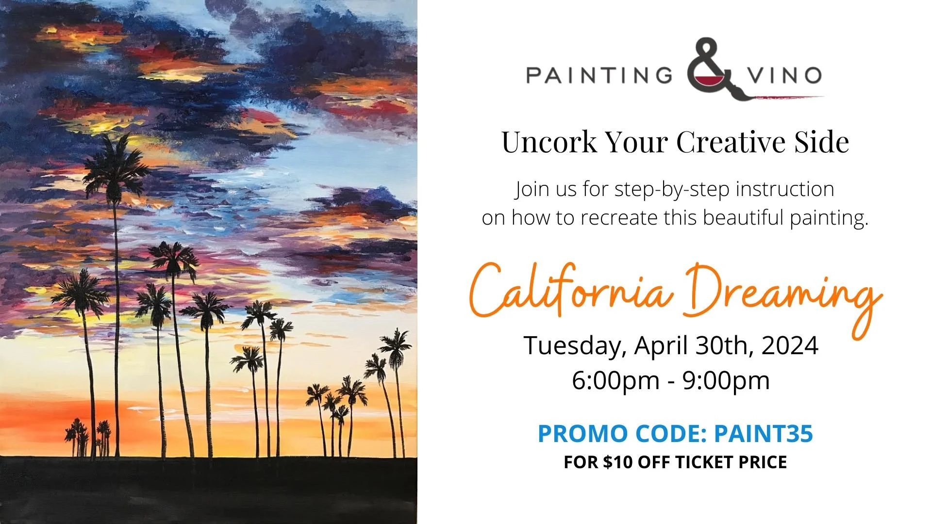 to register, visit: https://paintingandvino.com/event/california-dreaming-paint-and-sip/